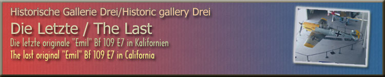 Die Letzte ihrer Art Eine kleine bebilderte Geschichte der "Weissen 14" aus Kalifornien beheimatet im "Museum of Flying", Saint Monica CA Diese Maschine ist ein Messerschmitt Bf-109E-7 mit der original Werknummer 3579. Sie wurde 1992 in Finnland entdeckt und zum jetzigen Originalzustand in Großbritannien restauriert. Der erste erfolgreiche Testflug fand während der Warbrirds-Show in Chino, U.S.A. statt. Dieses Flugzeug ist die einizge originale, flugfähige Bf-109 "Emil" der Welt, und damit die Letzte ihrer Art! Die hier gezeigten Bilder stammen von Kazuo Takei vom "Museum of Flying", 20. September 2000 Gebaut von Arado in E-1 Version, wurde die vormalige "Weisse 14 +" von 1(J)./LG 1 geflogen von Unteroffizier Hans-Joachim Marseille am 9.2.1940 bei Calais-Marck beschädigt, später zu E-7 konvertiert und als Weisse "7 +" zur 4./ JG 77 transferiert. Nach 20 % Beschädigung bei einem Einsatzflug mit Leutnant Fritz Geisshardt am 21.7.1941 repariert und diente dann bei der 4./JG 5 "Eismeer". Schwer beschädigt aufgegeben am 8.2.1942, wurde das Wrack ab 1992 nach Wiederentdeckung von Charlestone Aviation Services in England aufwendig restauriert und ist nun Bestandteil der Sammlung fliegender Legenden des "Museum of Flying" in Santa Monica, Kalifornien. Diese Maschine ist nun der einzige originale und flugfähige Luftwaffenjäger der Welt! Basierend auf der Bemalung dieses Flugzeuges habe ich meine "Luftschlacht um England" Tarnmuster in Bezug die Farbdarstellungen gestaltet. Ob die hier gezeigt Farbmischung in RLM 02 (hellgrau), RLM 71(dunkelgrün) und RLM 65 (lichtblau) den tatsächlich verwendenten Farben während des Krieges entspricht ist auch nicht 100 %, aber durch Recherche zumindestens "ziemlich" sicher !
