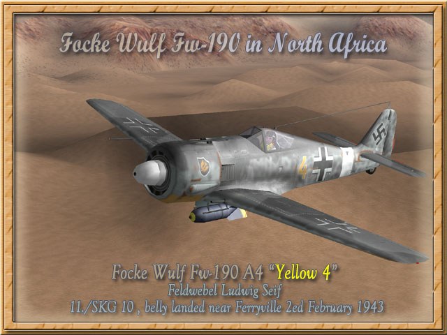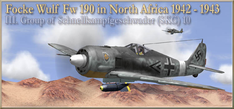 Persönliche Anmerkung/Private Remark: Please refer to the given Sources and Literature advises which I used in order to complete these paint schemes on the actually main or my Literature pages. Let me thank all members of different communities around the World Wide Web that shares necessary information's and historical relations to get these paint schemes so accurate as possible! *** "Luftwaffe - Focke Wulf Fw 190 in North Africa" III. Gruppe Schnellkampfgeschwader 10 (III./SKG 10) Historische Bemalung (Skins) und Informationen zu den Focke Wulf Fw-190 Flugzeugen der ehemaligen III./ZG 2 , im Dezember in III./SKG 10 umbenannte Einheit der Luftwaffe in North Afrika, fotografiert und gefunden auf Flugfelder und Schrottplätzen vom 16. November 1942 bis zum 8.Mai 1943. Historical paintwork and information regarding the Focke Wulf Fw-190 airplanes of the former III./ZG 2 in December renamed to III./SKG 10 Wing of the Luftwaffe in North Africa photographed and found on airfields and gathered on scrap yards from 16th November 1942 till the 8th May 1943.