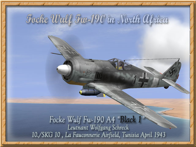 Focke Wulf Fw-190 A4 "Schwarze 1" (upload 24.06.2005) Bildquelle/Picture Source: Focke Wulf Fw 190 in North Africa, Seite/page 126 Eine weitere Focke Wulf 190-A4 der 10./SKG 10, wahrscheinlich geflogen von Leutnant Wolfgang Schreck, der die 10./SKG 10 von Februar bis zum Ende des Tunesien Feldzugs im Mai 1943 kommandierte. Statt des Staffelwappens war der Name "Rita" in schwarz auf der Haube aufgemalt. Another Focke Wulf 190-A4 of 10./SKG 10, probably flown by Leutnant Wolfgang Schreck who led 10./SKG 10 from February 1943 till the end of the Tunisia campaign in May 1943. The name "Rita" was painted in black on the left cowling side instead of the unit emblem. Bemalung mit Markierungen / Paintworks for FB with Markings Bemalung ohne Markierungen / Paintworks without Markings (blank))