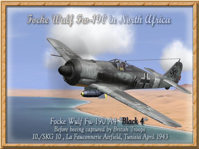 Focke Wulf Fw-190 A4 "Schwarze 4" (upload 27.06.2005) Bildquelle/Picture Source: Focke Wulf Fw 190 in North Africa, Seite/page 151 Diese Maschine war eine von 13 erbeuteten Fw 190 A4 des III./SKG 10 während Mai 1943 im Umkreis von Sidi Ahmed. Sie wurde mit provisorischen Markierungen versehen trotz Verbot von einigen britischen Piloten geflogen This was one out of 13 captured Fw 190 A4 of III./ SKG 10 during May 1943 around the area of Sidi Ahmed. Repainted with provisional Markings the plane was flight tested by some British Pilots. Bemalung mit Markierungen / Paintworks for FB with Markings Bemalung ohne Markierungen / Paintworks without Markings (blank)