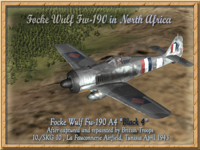 Focke Wulf Fw-190 A4 "RAF" (upload 27.06.2005) Bildquelle/Picture Source: Focke Wulf Fw 190 in North Africa, Seite/page 63 and 168 Hier die schwarze 4 in den provisorischen Markierungen. Ein rot-weiss-blaues Rechteck verdeckte das Balkenkreuz auf dem Rumpf, während das Hakenkreuz mit einem blauen Rechteck verdeckt und rote und weiße Streifen die britischen Farben ergänzten. Die Flügelkreuze erhielten ein blaues Rechteck mit einer roten Raute. Here the Black 4 in provisional Markings. Over painted with blue rectangles the wing crosses showed a red ditto on upper and lower. A red-white-blue rectangle was painted over the Crosses on the Fuselage while the swastika was over painted with a blue rectangle and red and white stripes. Bemalung mit Markierungen / Paintworks for FB with Markings