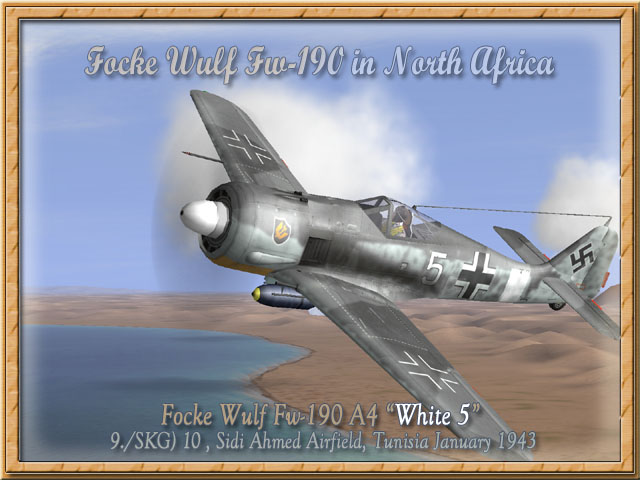 Focke Wulf Fw-190 A4 "Weisse 5" (upload 24.06.2005) Bildquelle/Picture Source: Focke Wulf Fw 190 in North Africa, Seite/page 55, 60, and 84 Eine Focke Wulf Fw 190 A4 in der typischen europäischen Tarnung RLM 74/75/76 mit weißem Spinner und dem Wappen der III./SKG 10 auf der linken Motorhaube fotografiert auf dem Flugplatz von Sidi Ahmed im Januar 1943. A typical Focke Wulf Assault plane of 9./SKG 10 in RLM 74/75/76 scheme with the unit emblem on left side of cowling as it was seen and photographed at Sidi Ahmed airfield in January 1943. Bemalung mit Markierungen / Paintworks for FB with Markings Bemalung ohne Markierungen / Paintworks without Markings (blank))