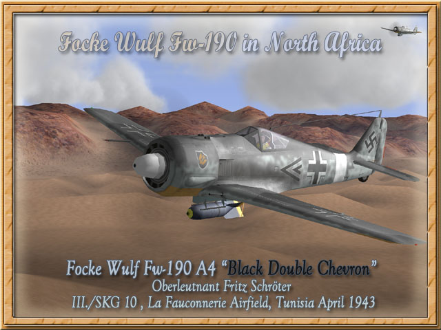 Focke Wulf Fw-190 A4 "Schwarze Doppelwinkel" (upload 24.06.2005) Bildquelle/Picture Source: Focke Wulf Fw 190 in North Africa, Seite/page 88, 135 and front cover Diese Focke Wulf 190 A4 flog normalerweise Oberleutnant Fritz Schröter, aber Leutnant Graf von Westerholt flog sie am für ihn schicksalhaften 8. April 1943, durch einen Flaktreffer in der Kabine getötet stürzte er mit der Maschine bei Mezzouna ab. Das Tarnschema ist RLM 74/75/76 Schema mit dem Staffelwappen auf der linken Motorhaube. This Focke plan was assigned normally to Oberleutnant Fritz Schröter, who was on the leave when Leutnant Graf von Westerholt take the plane on the faithful last day of his life when the cabin was hit but AA fire and the plane takes him down on 8th April 1943 near Mezzouna, Tunisia. The Camouflage pattern is RLM 74/75/76 with the unit emblem on the left side of the cowling. Bemalung mit Markierungen / Paintworks for FB with Markings Bemalung ohne Markierungen / Paintworks without Markings (blank))