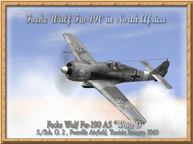 Focke Wulf Fw-190 A5 "Weisse D" (upload 27.06.2005) Bildquelle/Picture Source: Focke Wulf Fw 190 in North Africa, Seite/page 86, 150 and back side of cover Diese Focke Wulf 190 A5 fanden alliierte Truppen auf dem Flugfeld von Protville im Mai 1943 nach dem Rückzug der Deutschen Truppen. Das Tarnschema ist RLM 74/75/76 Schema mit dem Staffelwappen auf beiden Seiten der Motorhaube. This plane was found by advancing allied troops on Protville Airfield May 1943 after the retreat of the German troops out of Africa. The Camouflage pattern is RLM 74/75/76 with the unit emblem on the both sides of the cowling. Bemalung mit Markierungen / Paintworks for FB with Markings Bemalung ohne Markierungen / Paintworks without Markings (blank))