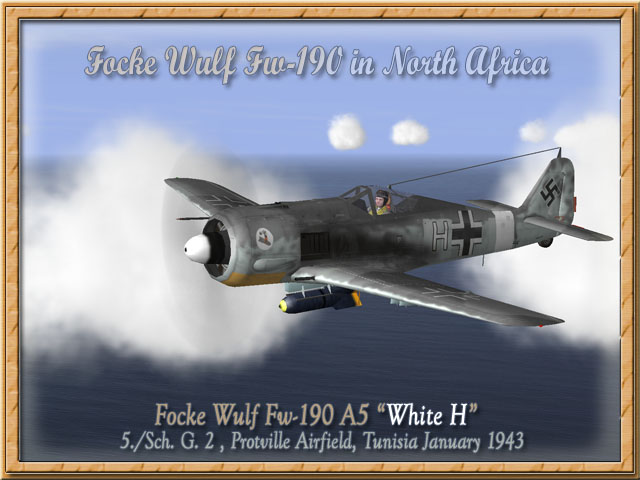 Focke Wulf Fw-190 A5 "Weisse H" (upload 27.06.2005) Bildquelle/Picture Source: Focke Wulf Fw 190 in North Africa, Seite/page 87 and 147 Eine Focke Wulf 190 A5 fotografiert auf dem Flugfeld von Protville im Mai 1943 vor dem Rückzug der Deutschen Truppen. Das Tarnschema ist RLM 74/75/76 Schema mit dem Staffelwappen auf der beiden Seiten der Motorhaube. This plane was fotographed on Protville Airfield May 1943 before the retreat of the German troops out of Africa. The Camouflage pattern is RLM 74/75/76 with the unit emblem on the both sides of the cowling. Bemalung mit Markierungen / Paintworks for FB with Markings Bemalung ohne Markierungen / Paintworks without Markings (blank)) )
