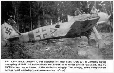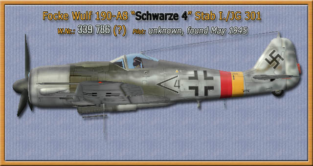 1. Focke Wulf 190 A8 Stab I./JG 301 "Schwarze 4" Diese Maschine fanden vorrückende amerikanische Soldaten in einem Waldstück, das als Unterstand für einen Feldflughafen diente. Die Nummer 339786 fand sich auf dem Panzerring, der den Lüfter schützte, aufgemalt. Die 20 mm-Außenkanonen waren aufgrund Gewichtsersparnis abmontiert.