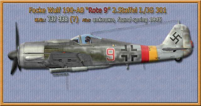 *** 2. Focke Wulf 190 A8 2. I./JG 301 "Rote 9" Diese Maschine fanden vorrückende amerikanische Soldaten am Rande eines ehemaligen Feldflughafen im Frühjahr 1945. Die Werknummer 737938 fand sich auf dem Leitwerk, allerdings schien das Leitwerk nicht original zum Rumpf zu gehören. Die Farbunterschiede lassen auf ein Austauschteil schließen. Bezüglich der Farbgebung erhielt ich auf Nachfragen im AllAboutWarfare-Forum den Hinweis, das die Nummer rot mit weißer Umrandung ausgeführt war (2. Staffel JG 301), deswegen habe ich die Bemalung mit der roten 9 ausgeführt!