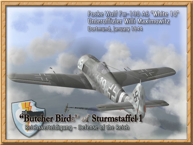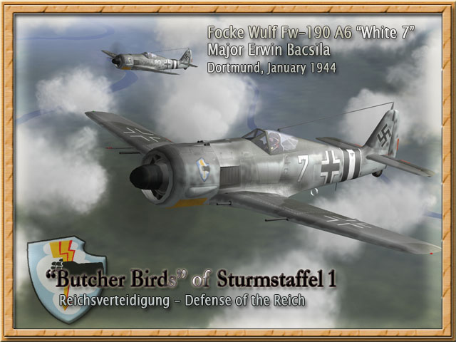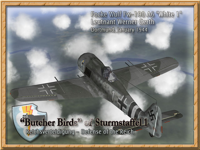 Gegründet am 19.10.1943 unter dem Kommando von Major Hans-Günther von Kornatzki entstand aus "Zwangsfreiwilligen" eine speziell für die Bekämpfung der schwer bewaffneten Bombergruppen der USAAF ausgebildete Einheit, die sogenannte "Sturmstaffel 1". Während des Bestehens der Sturmgruppe und ihrer bis zu 18 Piloten erfolgte die Stationierung zunächst in Dortmund (19.10.43 bis 29.2.44) und später in Salzwedel (29.2.44 bis 8.5.44). Die Einheit erhielt Focke Wulf Fw-190A-6 und später Fw-190A-7 Versionen (ab Februar/März 1944) mit verstärkter Seitenpanzerung, um gegen das Abwehrfeuer der Bordschützen besser geschützt zu sein. Dieses "Freiwilligen" Staffel erzielte beachtliche Erfolge, musste jedoch im späteren Verlauf große Verluste durch die ab Anfang 1944 nun durch agile Langstrecken Begleitjäger geschützten Bomberverbände hinnehmen.