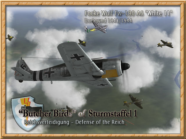 Founded 19th October 1943 and commanded by Major Hans-Günther von Kornatzki a special unit to fight the heavily armed Bomber Unit of the USAAF was formed out of "Voluntaries". These so called "Sturmstaffel 1" and their up to 18 Pilots was first based at Dortmund (19.10.43 till 29.2.44) later in Salzwedel (29.2.44 till 8.5.44). Equipped with Focke Wulf Fw190A-6 and later Fw-190A-7 Version (around February/March 1944) with additional armour to withstand the defensive fire of the Gunners onboard the Bombers this Fighter Wing achieved remarkable success during their existence but suffered more and more losses due to the agile Long Range Fighters beginning of 1944 now escorting the Bomber Squads. The Focke Wulf Fighters was marked with a "b lack-white-black" Ribbon bordered by thin white stripes around the aft fuselage area. The Fighter Wing exists till the 8th May 1944 when it was reassigned to the 11./JG 3.In Summer 1944 the Luftwaffe formed in Salzwedel area city of Kassel a new II. Group out of the staff group and the outlaw unit "Sturmstaffel 1" commanded by Mayor von Kornatzki. This new Group was now equipped with heavily armoured Focke Wulf 190 A8/R2 Assault Fighters assigned to fight the heavy American Bomber formations and was named like similar units of Jagdgeschwader 3 "Udet" as so called "Sturmgruppe" (Assault Group). During the same time III. Group was also newly formed and reequipped with Messerschmitt Bf-109 G6, G10 and G14 Fighters (later Bf-109 K4) focussing mainly to flew top cover for the Assault Fighters of the "Sturmgruppe". For recognition the Jagdgeschwader 4 uses the marking band of "Sturmstaffel 1", the " black-white-black" Reichsverteidigungsband (RVT) to identify to unit as part of the Reich's Defence.In Autumn 1944 the II. (Assault) Group and the III. Group suffered heavy loses fighting the overwhelming allied Fighter and Bomber formations. Under the command of Major (at this time) Gerhard Michalski the mostly inexperienced pilots was although capable to achieve remarkable success, which anyway didn't change the drainage and the downfall of the Luftwaffe.