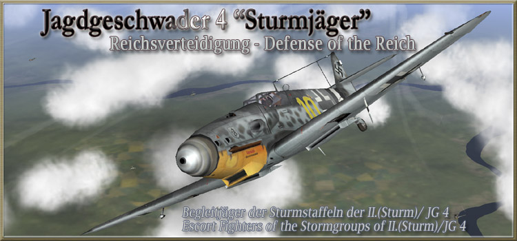 In Summer 1944 the Luftwaffe formed in Salzwedel area city of Kassel a new II. Group out of the staff group and the already well know outlaw unit "Sturmstaffel 1" commanded by Mayor von Kornatzki. This new Group was now equipped with heavily armoured Focke Wulf 190 A8/R2 Assault Fighters assigned to fight the heavy American Bomber formations and was named like similar units of Jagdgeschwader 3 "Udet" as so called "Sturmgruppe" (Assault Group). During the same time III. Group was also newly formed and reequipped with Messerschmitt Bf-109 G6, G10 and G14 Fighters (later Bf-109 K4) focussing mainly to flew top cover for the Assault Fighters of the "Sturmgruppe". For recognition the Jagdgeschwader 4 uses the marking band of "Sturmstaffel 1", the " black-white-black" Reichsverteidigungsband (RVT) to identify to unit as part of the Reich's Defence.In Autumn 1944 the II. (Assault) Group and the III. Group suffered heavy loses fighting the overwhelming allied Fighter and Bomber formations. Under the command of Major (at this time) Gerhard Michalski the mostly inexperienced pilots was although capable to achieve remarkable success, which anyway didn't change the drainage and the downfall of the Luftwaffe.