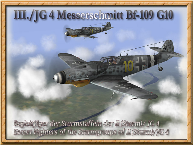 Messerschmitt Bf-109 G10 der/of III./JG 4 1944 (Update 01.08.05) Bemalung mit Markierungen 9./JG 4 (Weiss) / Paintworks for FB with Marking of 9./JG4 (White) Bemalung mit Markierungen 11./JG 4 (Gelb) / Paintworks for FB with Marking of 11./JG4 (Yellow) Bemalung ohne Markierungen / Paintworks for FB without Markings (blank)