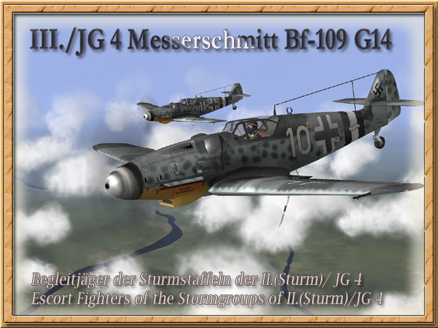 Messerschmitt Bf-109 G14 der/of III./JG 4 1944 (Update 01.08.05) Bemalung mit Markierungen 9./JG 4 (Weiss) / Paintworks for FB with Marking of 9./JG4 (White) Bemalung mit Markierungen 10./JG 4 (Schwarz) / Paintworks for FB with Marking of 10./JG4 (Black) Bemalung ohne Markierungen / Paintworks for FB without Markings (blank)