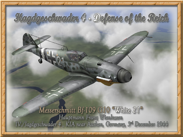 In October 1944 a part of JG 4 formed the IV. Group that was equipped with Messerschmitt Bf-109 Fighters. Beginning from November 1944 JG 4 flew its mission now from Frankfurt am Main area. During the operations around the Battle of the Bulge and "Operation Bodenplatte" the wings of Jagdgeschwader 4 was again heavily decimated. Even it's main targets Löwen and Le Culot JG 4 the units failed to reach during ”Operation Bodenplatte”. Mid of January 1945 the Squadron was relocated to the area of Guben-Jüterbog . There again the Groups suffers heavy loses fighting the Russian bridge heads on the River Oder. The II. (Assault) Group with its Focke Wulf planes flew their last sorties against the soviet armies and VVS around the area of Berlin. In April 1945 withdrawal to Schleswig-Holstein the Jagdgeschwader 4 was disbanded on May 8th, 1945.