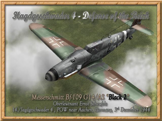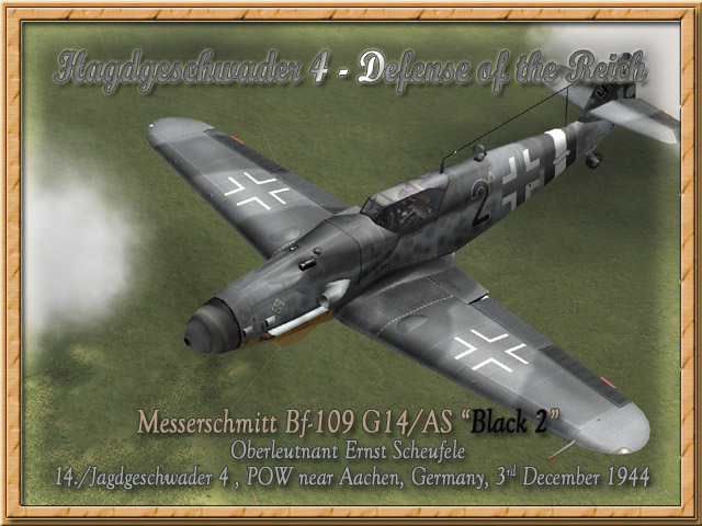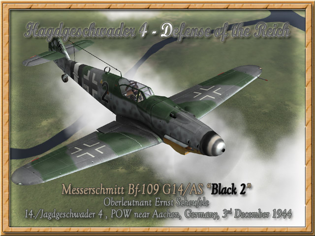 Messerschmitt Bf-109 G14/AS IV./JG 4 "Schwarze 2" 1944 (Update 17.8.05) Pilot: Oberleutnant Ernst Scheufele on December 3, 1944 Bildquelle/Picture Source: Sturmjäger Volume 2, Erich Mombeek - Seite/Page 91-97 Mit dieser Maschine landete Oberleutnant Ernst Scheufele nach Flaktreffern auf einem Rübenfeld nach Bodenkampfeinsätzen nahe Aachen gegen alliierte Stellungen not. Oberleutnant Scheufele war Kommandeur der 14./JG 4 und erreichte insgesamt 18 bestätigte Abschüsse. Aufgrund der fehlenden Informationen habe ich drei Versionen erstellt. During a fatale Ground Attack Mission against allied positions near the German Town of Aachen on December 3, 1944 Oberleutnant Ernst Scheufele belly landed after hits by anti aircraft fire on a beet field. As commanding officer of the 14. Group he achieved 18 aerial Victories. Because of a lack of information's I decided to paint three Versions of the Airplane. Bitte alternativ in den Ordner der Bf-109-G6AS kopieren, da es in IL2 keine Bf-109 G14/AS gibt die in IL2 vorhandene Bf-109 G6/AS der eher als das IL2 G10-Modell der G14/AS entspricht! Für die richtigere Darstellung (Antenne am Flügel) verwendet bitte dann den Ordner Bf-109-G10. Please copy alternative this skin into the Bf-109-G6AS file because the Bf-109-G6/AS in IL2 is actually more equal to the Bf-109-G14/AS Model! For correct wing area (Antenna) use the In game File for the Bf-109-G10 Model