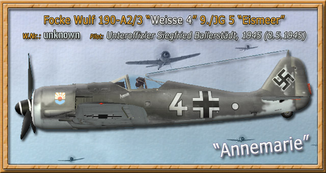 Focke Wulf 190 A3 "Weisse 4" (Update 21.02.2005) Unteroffizier Siegfried Ballerstädt Maschine mit dem aufgemalten Namen "Annemarie". Da FB/PF keine Fw-190 A3 beinhaltet bitte das Schema in den Fw-190 A4 Ordner kopieren. Unteroffizier (Corporal) Siegfried Ballerstädts plane with the painted name "Annemarie". Because FB/PF suits no Fw-190 A3 version copy the paint scheme into the Fw-190 A4 file. Bemalung mit Markierungen / Paintworks for FB with Markings Bemalung ohne Markierungen / Paintworks without Markings (blank)