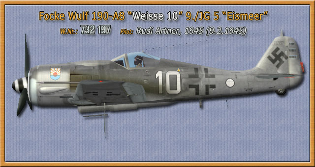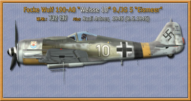 Focke Wulf 190 A8 "Weisse 10" Version 2 (Update 25.03.2004) Feldwebel Rudi Artners Maschine bis zum "Black Friday´", 9.2.1945, danach wahrscheinlich umlackiert oder erneuert. Deshalb habe ich die Markierungen und W.Nr. belassen! Suche aber noch weitere Informationen! Feldwebel (Sergeant) Rudi Artners plane till "Black Friday, 9th February 1945, later repainted or superseded. Therefore I left his markings and the W.Nr.! More information follows... Bemalung mit Markierungen / Paintworks for FB with Markings Bemalung ohne Markierungen / Paintworks without Markings (blank)