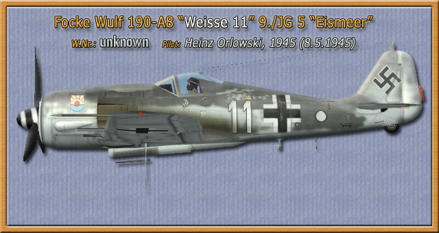 Focke Wulf 190 A8 "Weisse 11" (Update 25.03.2004) Heinz Orlowski (Pilot der "Weissen 1") flog dieses Flugzeug mit dem Namen "Sigrid" zumindest bei zwei Einsätzen, nachdem die Weisse 1 bei der Luftschalcht am "Black Friday" am 9.2.1945 verloren ging! Heinz Orlowski (Pilot of the "White 1") used this plane named "Sigrid" definitely during two missions, after losing the "White 1" in the arial battle on "Black Friday", 9th February 1945. Bemalung mit Markierungen / Paintworks for FB with Markings Bemalung ohne Markierungen / Paintworks without Markings (blank)