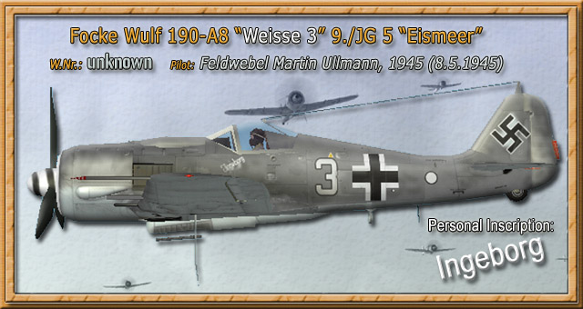 Focke Wulf 190 A8 "Weisse 3" (Update 25.03.2004) Feldwebel Martin Ullmanns Maschine mit dem aufgemalten Namen "Ingeborg". Feldwebel (Sergeant) Martin Ullmann plane with the painted name "Ingeborg". Bemalung mit Markierungen / Paintworks for FB with Markings Bemalung ohne Markierungen / Paintworks without Markings (blank)