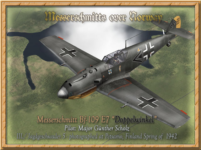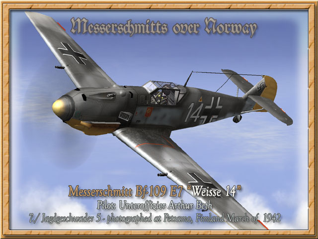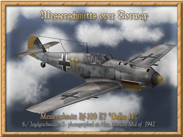 Nach der offiziellen Neuaufstellung des Jagdgeschwader 5 am 25. Januar 1942 aus in Norwegen stationierten Einheiten des JG 77 waren die Jagdstaffel der I., II. and III. Gruppe des JG 5 mit einsitzigen Jäger der Typenreihe Messerschmitt Bf-109T-2, die aus den umgebauten Versuchsmustern der Trägervarianten Bf-109T-1 entstanden und Flugzeugen der Reihe Messerschmitt Bf-109E-7 ausgerüstet. Die Bf-109 "Emil" flogen bis zum Herbst bei der 7./ JG 5 bevor alle Staffel letztendlich auf die neuere Bf-109 "Friedrich" umgerüstet waren. After official forming of the newly Fighter Units of Jagdgeschwader 5 on 25th January 1942 out of the existing Norway based Units of JG 77 the fighter wings of the I., II. and III. Group of JG 5 was mainly equipped with single fighter planes of the type Messerschmitt Bf-109T-2, which was rebuild out of the remaining Test variant Bf-109T-1 for carrier deployment and the type Bf-109E-7. The Bf-109 "Emil" was used till autumn 1942 with 7./JG 5 than finally all Groups was reequipped with the newer Bf-109 "Friedrich".