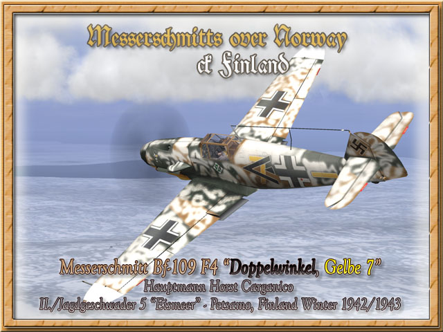 Messerschmitt Bf-109 F4 "Schwarzer Winkel, Gelbe 7" (Update 21.03.2007) Bildquelle/Picture Source: Kjetil Åkra , Book of Eric Mombeek, Eismeerjäger Volume 2 (Page 326) Die hier gezeigte Bf-109 F-4/Trop flog Hauptmann Horst Carganico, nach seiner Notlandung auf feindlichem Territorium am 12. August 1942. Die Maschine war eine Ersatzmaschine, die Hauptmann Carganico nach seiner Notlandung im Winter 1942 auf 1943 geflogen hat. Das Mickey Mouse Emblem zeigte hier die beiden am Schnürsenkel gehaltenen Schuhe, die Horst Carganicos Bruchlandungen symbolisieren (die erste am 22.07.1942, die Zweite am 12.08.1942), nach denen er jeweils "auf dem Schuhwerk" zurückkehrte. Das Flugzeuge zeigte den Doppelwinkel ohne zusätzliche Übermalung über eine gelbe 7 aufgetragen, das vierblättrige Kleeblatt der II. Gruppe und eine wellenförmige, mit vielförmigen Tupfern gestaltet Wintertarnung aus weißer Temperfarbe. Das Grundtarnschema war das bei der 6. Staffel des Jagdgeschwader 5 übliche mediterrane RLM 70/79/78 Schema.
