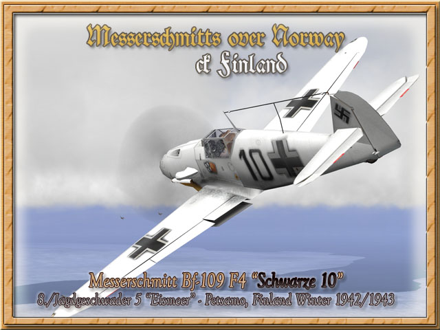 Messerschmitt Bf-109 F4 "Schwarze 10" (Update 21.03.2007) Bildquelle/Picture Source: Kjetil Åkra , Book of Eric Mombeek, Eismeerjäger Volume 2 and KAGERO JG 5 "Eismeer" 1942 - 1945 Diese Bf-109 F-4 der 8./JG 5 stationiert in Petsamo, Finnland im Winter 1942/1943 zeigt eine andere Art der Wintertarnung. Weiße Temperfarbe ist hier komplett auf den Oberseiten der Tragflächen und des Rumpfes verteilt, die Markierungen sind jedoch bis auf die untere Seite des Rumpfkreuzes frei zu erkennen. Die Maschine zeigte das beidseitige Staffelwappen und die üblichen gelben Markierungen. Die Balkenkreuze auf den oberen Flächenseiten und dem Rumpf waren etwas nachgedunkelt.