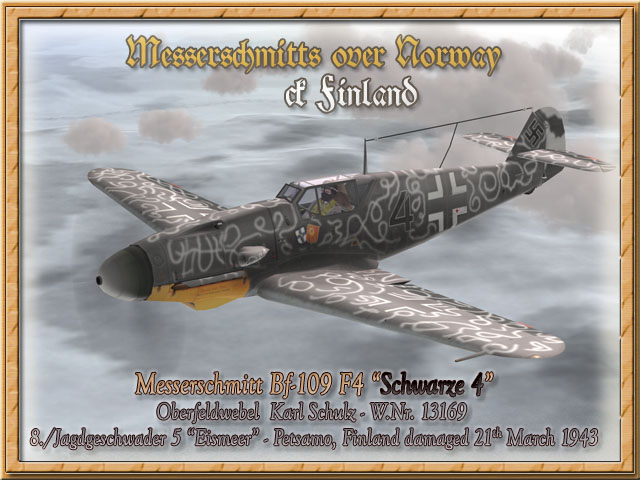 Messerschmitt Bf-109 F4 "Schwarze 4" (Update 21.03.2007) Bildquelle/Picture Source: Kjetil Åkra , Book of Eric Mombeek, Eismeerjäger Volume 2 and KAGERO JG 5 "Eismeer" 1942 - 1945 Eine schöne Bf-109 F-4 der 8./JG 5 stationiert in Petsamo, Finnland im Winter 1942/1943 aufgenommen. Berühmt wurde diese von Oberfeldwebel Schulz bei einem Landeunfall am 21. März 1943 durch Überschlag beschädigte Maschine durch die vielen Veröffentlichungen und ihr spektakuläres mäanderförmiges Tarnschema in hellen Bändern über einem nicht standardförmigen RLM 74/75/76 Schema. Die Maschine zeigte das Staffelwappen auf beiden Rumpfseiten, breite, gelbe Flügelspitzen bis zum Balkenkreuz der unteren Flächen und eine gelbe Kühlerunterseite.