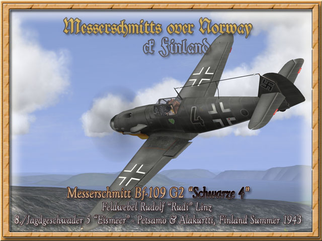 Messerschmitt Bf-109 G-2 "Schwarze 4" (Update 21.03.2007) Bildquelle/Picture Source: Kjetil Åkra KAGERO JG 5 "Eismeer" 1942 - 1945 page 49 and upcoming Book of Eric Mombeek, Eismeerjäger Volume 3 Eine schöne Bf-109 G-2 der III. Gruppe (8. Staffel) des JG 5 stationiert in Petsamo, Finnland Sommer 1943. Diese Maschine flog der damalige Unteroffizier Rudolf "Rudi" Linz (KIA 09.02.1945) nach seiner Rückkehr zum JG 5. Sein persönliches Zeichen ein grünes Herz mit dem Namen "Gretel" in Gelb erinnert an seine Heimatstadt und seine Liebe. Die Maschine zeigte eine mit einem dunklem Grauton übermalte RLM 74/75/76 Tarnung, gelbe Flügelspitzen bis zum Balkenkreuz auf dem unteren Flügeln, sowie den schwarzen Kreis als Kennzeichen der Zugehörigkeit zur dritten Gruppe des JG 5. A very nice Bf-109 G-2 of the III. Group and 8th Fighter Wing of JG 5 based at Petsamo, Finland Summer 1943. The plane was flown by at this time Unteroffizier Rudolf "Rudi" Linz (KIA 09.02.1945) after his return to JG 5. His personnel emblem, a green heard with the yellow inscription "Gretel" remembering to his homestead and his love was drawn on the left fuselage side only. The plane sports a RLM 74/75/76 scheme over painted with a dark grey colour, yellow brode wingtips on the bottom wings and a black circle with a white border stating the assinment to the third group of JG 5.