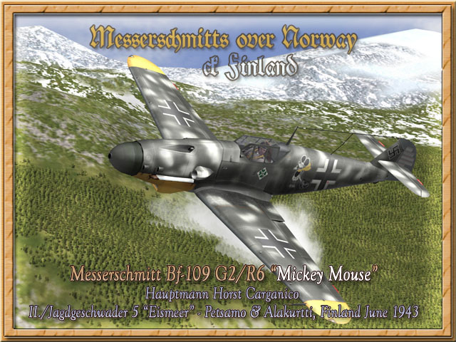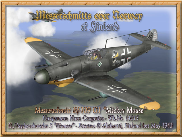 Messerschmitt Bf-109 G-1 "Mickey Mouse" (Update 21.03.2007) Bildquelle/Picture Source: Kjetil Åkra, KAGERO JG 5 "Eismeer" 1942 - 1945 and Book of Eric Mombeek, Eismeerjäger Volume 2 Internet link: http://toonsatwar.blogspot.com/ (Toons at war) Eine der ersten Bf-109 G-1 mit Druckkabine der II. Gruppe des JG 5 geflogen von Hauptmann Horst Carganico in Petsamo & Alakurtti, Finnland im Sommer 1943. Bei seinen älteren Modelle (Bf-109 F) führte Horst Carganico seine persönliches Emblem als kleine Abbildung auf der linken Motorhaube. Dies änderte sich mit seinem Umstieg auf die G-Reihe, Hauptmann Carganico ließ sich auf beide Seiten des Rumpfes das Mickey Mouse Emblem als Kennzeichen aufmalen. Die Mickey Mouse zog an Bänder zwei Schuhe hinterher, welche die Daten der Notlandungen nach Abstürzen und den notwendigen Rückmarsch (die erste am 22.07.1942, die Zweite am 12.08.1942) "auf Schusters Rappen" symbolisierten. Die Maschine zeigte eine mit einem dunklem Graugrünem Farbton übermalte RLM 74/75/76 Tarnung, gelbe Flügelspitzen, sowie das vierblättrige Kleeblatt der II. Gruppe des JG 5 unterhalb des Cockpits nur auf der linken Rumpfseite. Das Ruder war in RLM 75 (hellgrau) lackiert und zeigte linksseitig 53 Abschussmarkierungen.