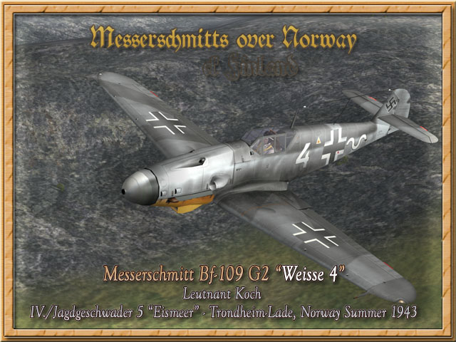 Messerschmitt Bf-109 G-4 "Weisse 4" (Update 21.03.2007) Bildquelle/Picture Source: Kjetil Åkra and in Messerschmitt Bf109 F, G, and K: An Illustrated Study on page 73 Eine schöne Bf-109 G-4 (deshalb die Fahrwerksbeulen auf den Tragflächen) der IV./JG 5 stationiert in Trondheim-Lade in Norwegen im Sommer 1943. Die Maschine zeigte ein Bemalung in RLM 74/75/76 mit nachgedunkelten Seitenbereichen am Rumpf und die schwarz eingefasste weiße Welle der IV. Gruppe. Geflogen wurde diese Maschine von Leutnant Koch im Sommer 1943. A very nice Bf-109 G-4 (because of that the plane shows the bulges of bigger wheels on top of the wings) of the IV. group of JG 5 based at Trondheim-Lade in Norway Summer 1943. The plane was painted in RLM 74/75/76 colours with a darkened fuselage area and showed the black bordered white wave of IV. Group. The plane was flown by Leutnant Koch in Summer 1943.