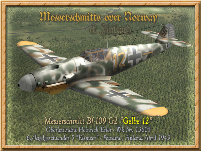 Messerschmitt Bf-109 G-2/R6 "Gelbe 12" (Upload 22.03.2007) Bildquelle/Picture Source: Kjetil Åkra , Book of Eric Mombeek, Eismeerjäger Volume 2 and KAGERO JG 5 "Eismeer" 1942 - 1945 Oberleutnant Heinrich Erler flog diese Bf-109 G-2/Trop im April 1943 und bestätigte zu diesem Zeitpunkt mit 77 Luftsiegen seine herausragende Karriere als Fliegerass. Die Maschine hatte gelb lackierte Flügelspitzen sowie eine gelb lackierte Unterseite des Kühlers. Das Farbschema war eine Kombination aus weißer Temperfarbe auf der grüne unregelmäßige Flecken in RLM 70 aufgesprüht waren. Zu diesem Zeitpunkt verblassten die Farben bereits und zeigten durchlässig den interessanten Untergund. Da die Maschinen der gelieferten Serien alle Bf-109 G-2/Trop Ausführungen waren, ist die Maschine in der Grundtarnung mit RLM 79 "Sandbraun" lackiert. Weiterhin zeigte die Hecksektion den schwarz gerahmten gelben Balken als Zeichen der 6. Staffel der II. Gruppe des JG 5.