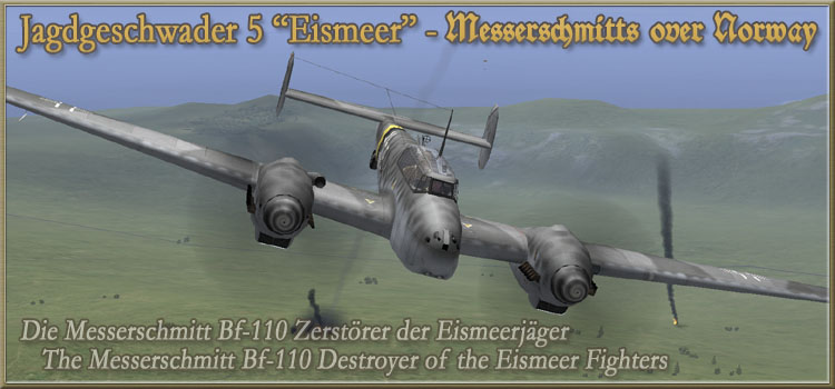 Für mehr Informationen zu diesem Thema besucht bitte die Seite der SIG Luftwaffe in Norway Web organisation, die eine Zentralstelle für die geschichtlichen Informationen und Hintergründe bietet und weitere detaillierte Hintergrundinformationen bereitstellt insbesondere über den Einsatz der Messerschmitt Bf-110 in Norwegen und Finnland bis Mai 1945 bereitstellt. Auch hier haben die Herren Kjetil Åkra und Olve Dybvig mit dem dort verfügbaren Dokumenten die wesentlichen Informationen zu den Bemalungen geliefert. Die beiden Eismeer Bücher von Eric Mombeek bringen in Ergänzung dazu die notwendigen Erfahrungen und Erlebnisse der Piloten und Bordfunker während ihrer Einsätze in das Gedächtnis zurück. For further information's you definitely have to visit the page of the SIG Luftwaffe in Norway Web organisation, which covers in Detail the historic events and information related to Luftwaffe Activities in Norway and Finland till the End of World War II in May 1945. Especially I like to draw your attention the downloadable article written by Kjetil Åkra and Olve Dybvig, which delivered the vital information's for my work. In addition both available Book written and published by Eric Mombeek reveals the live and experiences of the combat pilots and their radio operators or Navigators during their Missions. *** Achtung / Attention Bitte achtet auf die Beschreibung der Bemalungen, da es in IL2-FB-AOE-PF 3 Bf-110 Modelle gibt! Die Bf-110 C unterscheidet sich von der Bf-110G-2 in Bezug auf Leitwerk und Leistung. Ich habe den Speicherort vor den Ladelinks vermerkt! Please watch out for the correct storage file in the Skin Files of IL2-FB-AOE-PF, because there are three different versions of the Bf-110 available. The Bf-110 C differs in relation to the tail plane (Rudder) and power specifications from the Bf-110 G-2. I have put a remark for correct storage file before the Download link. ***