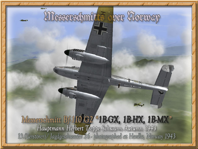 Messerschmitt Bf-110 G-2 "1B-GX, 1B-HX and 1B-MX" (Upload 27.09.2005) Bildquelle/Picture Source: Kjetil Aakara from Airwar over the North Message Board and Book of Eric Mombeek, Eismeerjäger Volume 1 and KAGERO JG 5 "Eismeer" 1942 - 1945 Diese drei Flugzeuge flogen 1943 zusammen mit Hauptmann Treppe einen Angriff auf sowjetische Versorgungslinien, deshalb biete ich euch damit dann eine kompletten Schwarm für Missionsdateien an. These three planes flown successful ground attack mission under the command of Captain Treppe, therefore I hand you the possibility to have a full "Schwarm" for Missions available. Speichern in Ordner / Place in File Bf-110G-2! Bemalung mit Markierungen / Paintworks for FB with Markings