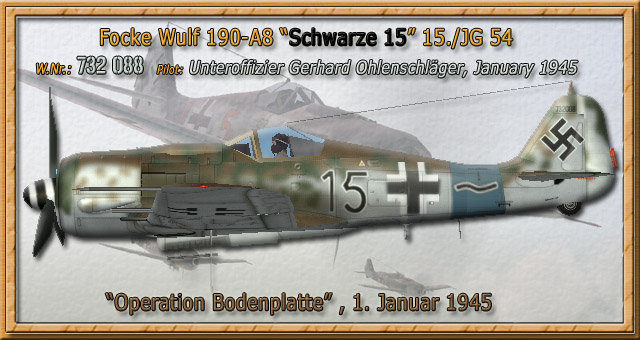 Focke Wulf 190 A8 "Schwarze 15" (Update 10.06.2004) Während der letzen Offensive der deutschen Luftwaffe musste Unteroffizier Gerhard Ohlenschläger nach Flaktreffern notlanden und geriet danach direkt in amerikanische Gefangenschaft. During the last major offensive of the Luftwaffe called "Operation Bodenplatte" Unteroffizier Gerhard Ohlenschläger was forced to belly land by anti aircraft fire and was take prisoner by allied forces. Bemalung mit Markierungen / Paintworks for FB with Markings Bemalung ohne Markierungen / Paintworks without Markings (blank)