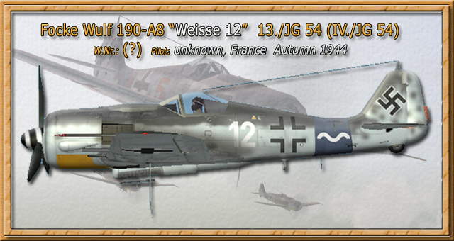 Focke Wulf 190 A8 "Weisse 12" (Update 23.06.2004) Eine Focke Wulf der 13./JG 54 mit einem Rumpfkreuz in schwarzen Konturen Herbst 1944.. A Focke Wulf of the 13th echelon JG 54 with only a the outlines of the fuselage cross Autumn 1944. Bemalung mit Markierungen / Paintworks for FB with Markings Bemalung ohne Markierungen / Paintworks without Markings (blank)