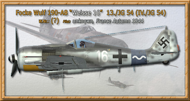 Focke Wulf 190 A8 "Weisse 16" (Update 23.06.2004) Eine weitere Focke Wulf der 13./JG 54, hier ist nur das schwarze Kreuz auf dem Rumpf gezeichnet. Der gelbe Kreis auf der MG-Abdeckhaube bezeichnet den Einbau eines BMW 801 D-2 Motor mit erhöhter Notleistung. Another Focke Wulf of the 13th echelon JG 54, here only the black inner cross is painted on the fuselage. The yellow circle on the MG cover hood signals the installation of a BMW 801 D-2 engine with emergency power. Bemalung mit Markierungen / Paintworks for FB with Markings Bemalung ohne Markierungen / Paintworks without Markings (blank)