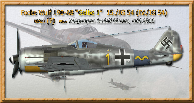 Focke Wulf 190 A8 "Gelbe 1" (Update 23.06.2004) Eine Focke Wulf der IV. Staffel des JG 54 geflogen von Staffelkapitän Hauptmann Rudolf Klemm im Herbst 1944. A Focke Wulf of the IV. group of JG 54 flown by Echelon commander Rudolf Klemm Autumn 1944. Bemalung mit Markierungen / Paintworks for FB with Markings Bemalung ohne Markierungen / Paintworks without Markings (blank)