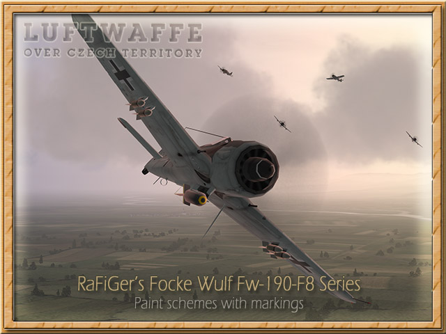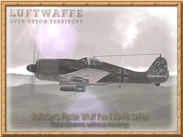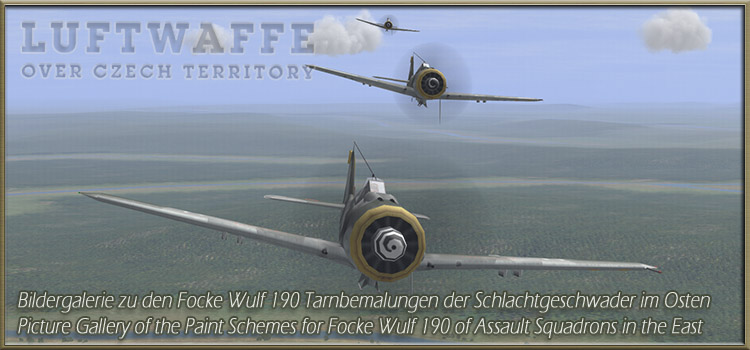 Persönliche Anmerkung/Private Remark: Please refer to the given Sources and Literature advises which I used in order to complete these paint schemes on the actually main or my Literature pages. Let me thank all members of different communities around the World Wide Web that shares necessary information's and historical relations to get these paint schemes so accurate as possible! *** Bildergallerie / Picture gallery Luftwaffe über dem tschechischen Territorium 1945 Luftwaffe over Czech Territory 1945 Auf dieser Seite findet ihr eine Bildergalerie zu allen von mir angefertigten Bemalungen der Focke Wulf 190 Flugzeuge der "Luftwaffe over Czech Territory 1945" Serie. Die historischen Informationen zu den Bemalungen stammen hauptsächlich aus den von JaPo Publishing veröffentlichten Bänden über die in Tschechien und Slowenien bis 1945 stationierten Luftwaffen Einheiten . Ein Liste der der komplett von mir verwendeten Literatur zu diesem Thema findet ihr am Ende dieser Seite und auch auf den einzelnen Webseiten der verschiedenen Einheiten. Zu den Bildern folgt dann eine kurze Beschreibung der Maschine und der zugeordneten Einheit, sowie ein Link zum Herunterladen des Tarnschemas für die IL-2 Sturmovik Serie bis IL-2 Sturmovik 1946 von 1C-Maddox und UBIsoft. On these pages I present a gallery of all my painted Schemes for the Focke Wulf 190 F8 belonging to the "Luftwaffe over Czech Territory 1945" series. The historical Information's enabling me to draw these paint schemes are mainly based on the various publications of JaPo Publishing covering the until 1945 in Czech and Slovakia based units of the German Luftwaffe. A complete List of all used resources are available at the end of this page an all other single pages representing the different units of the Luftwaffe. To the pictures you find a short description of the airplanes and the assigned unit together with a link to download the paint scheme for the IL-2 Sturmovik series till IL-2 Sturmovik 1946 by 1C-Maddox and UBIsoft.