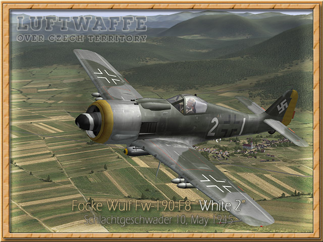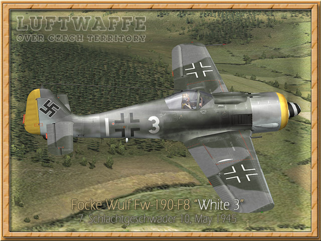 Focke Wulf 190-F8 der/of 7./SG 10 "Weiße 2" JaPo - "Luftwaffe over Czech Territory 1945" Diese Maschine erhielt einen kompletten RLM 71 oder 83 Anstrich, um die alte Tarnung zu verbessern, die Antriebseinheit verblieb jedoch in verwaschenem RLM 75. Das Hakenkreuz in komplettem weiß war ebenfalls eine Besonderheit. Diese Maschine flog bei der 7. Gruppe des SG 10 und fand sich 1945 auf dem Flugfeld bei České Budějovice (deutsch Böhmisch Budweis oder Budweis).