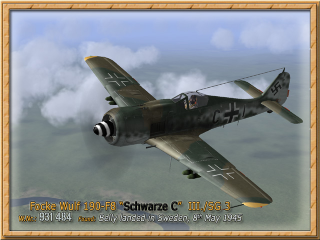Focke Wulf 190 F8 "Schwarze C" (upload 25.04.2005) Bildquelle/Picture Source: Bo Widfeldt, The Luftwaffe in Sweden 1939-1945, MONOGRAM 1983 Bookie's Page at http://fw190.hobbyvista.com/sweden.htm Eine Focke Wulf 190 F8 der III./ SG 3 photographiert nach Landung am 8. Mai 1945 A Focke Wulf 190 F8 of III./SG 3 photographed after landing May 1945. Bemalung mit Markierungen / Paintworks for FB with Markings Bemalung ohne Markierungen / Paintworks without Markings (blank)