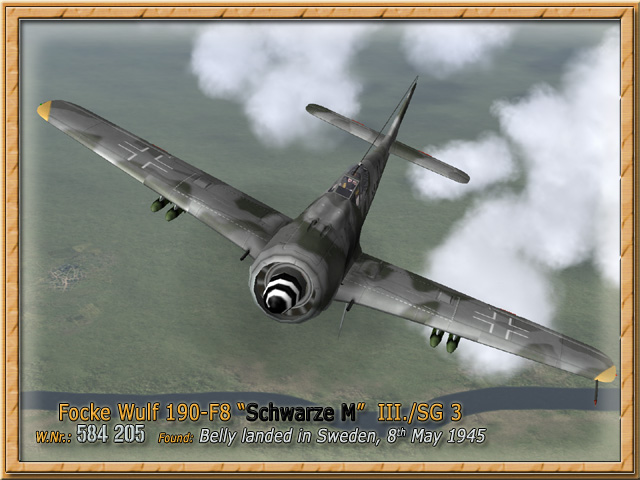 Focke Wulf 190 F8 "Schwarze M" (upload 25.04.2005) Bildquelle/Picture Source: Bo Widfeldt, The Luftwaffe in Sweden 1939-1945, MONOGRAM 1983 Bookie's Page at http://fw190.hobbyvista.com/sweden.htm Eine Focke Wulf 190 F8 der III./ SG 3 photographiert nach Bruchlandung am 8. Mai 1945 A Focke Wulf 190 F8 of III./SG 3 photographed after belly landing May 1945. Bemalung mit Markierungen / Paintworks for FB with Markings Bemalung ohne Markierungen / Paintworks without Markings (blank)