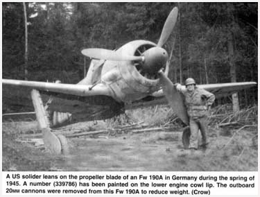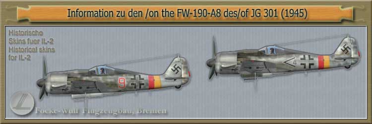 Informationen zu den FW-190 A8 des JG 301 Information to the FW-190 A8 of JG 301 1. Focke Wulf 190 A8 Stab I./JG 301 "Schwarze 4" Diese Maschine fanden vorrückende amerikanische Soldaten in einem Waldstück, das als Unterstand für einen Feldflughafen diente. Die Nummer 339786 fand sich auf dem Panzerring, der den Lüfter schützte, aufgemalt. Die 20 mm-Außenkanonen waren aufgrund Gewichtsersparnis abmontiert.