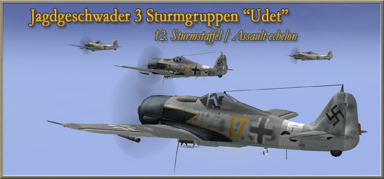 Auf dieser Seite findet ihr nun einige Fw 190 A8-Modelle mit Tarnanstrichen des Jagdgeschwaders 3 "Udet" aus dem Jahre 1944. Um für die eigenen Jagdflieger die Erkennung der Sturmgruppen zu erleichtern, erhielten diese eine dunkle Motorhaube in einem blau-schwarzen (FS 260044) Anstrich und ein weißes Rumpfband mit der schwarzen Welle, dem Symbol der IV. Gruppe. Die Einfassung der ehemaligen Adlerschwingen wurde in der Staffelfarbe gestaltet, somit gelb für die 12. Staffel. Diese Bemalung änderte sich erst gegen Ende 1944, als die Überlegenheit der allierten Luftverbände die deutschen Geschwader zwang, ihre Flugzeuge besser zu tarnen und damit auf auffällige Bemalungen zu verzichten. Die Sturmgruppen übermalten dann die Hauben und Rumpfbänder in den Standardfarben RLM 74, 75 und 76.
